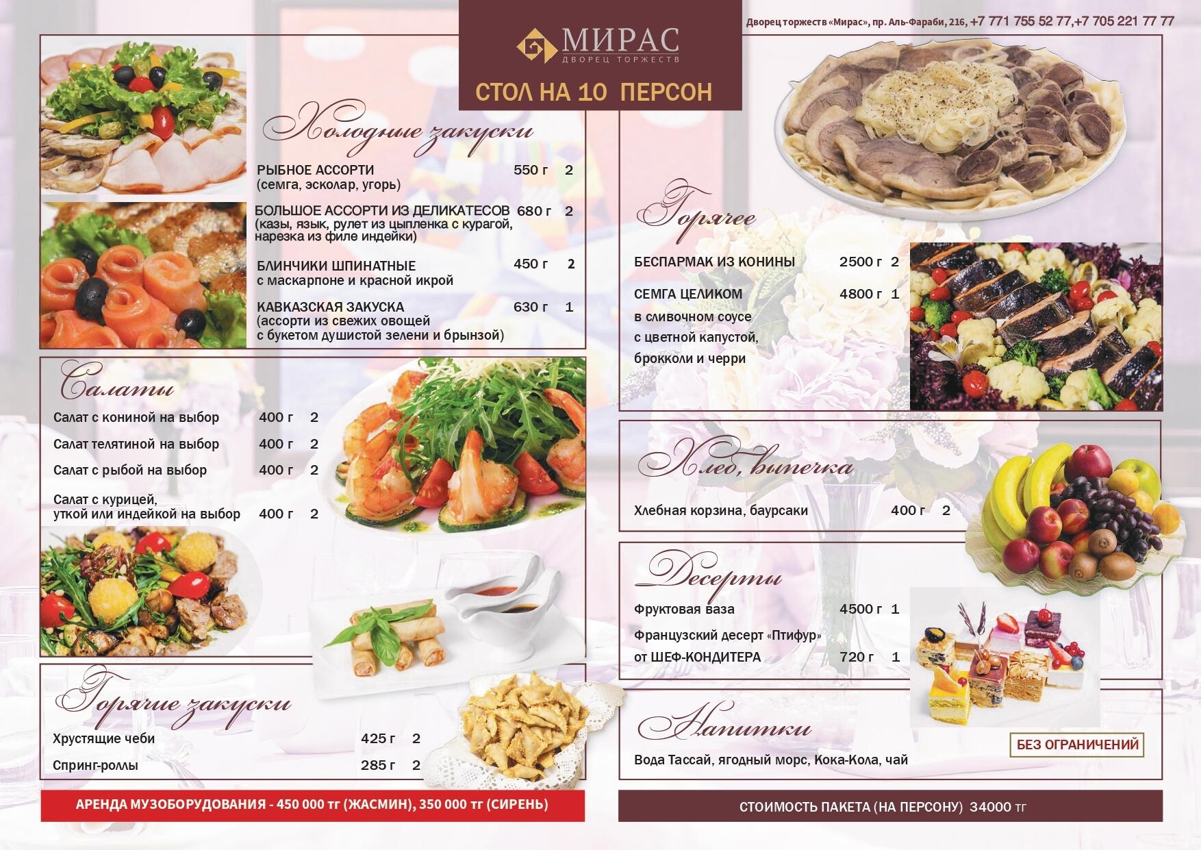 Банкетное меню - 34000 тенге на персонуБанкетное меню - 32000 тенге на персонуНовогоднее меню - 36000 тенге на персонуНовогоднее меню - 39000 тенге на персонуНовогоднее меню - 42000 тенге на персонуМеню на Кудалык 40.000 тг с персоныДетское менюМеню на Ас - 15500тг на персонуМеню на Ас - 17500тг на персонуМеню на Ас - 19500тг на персону